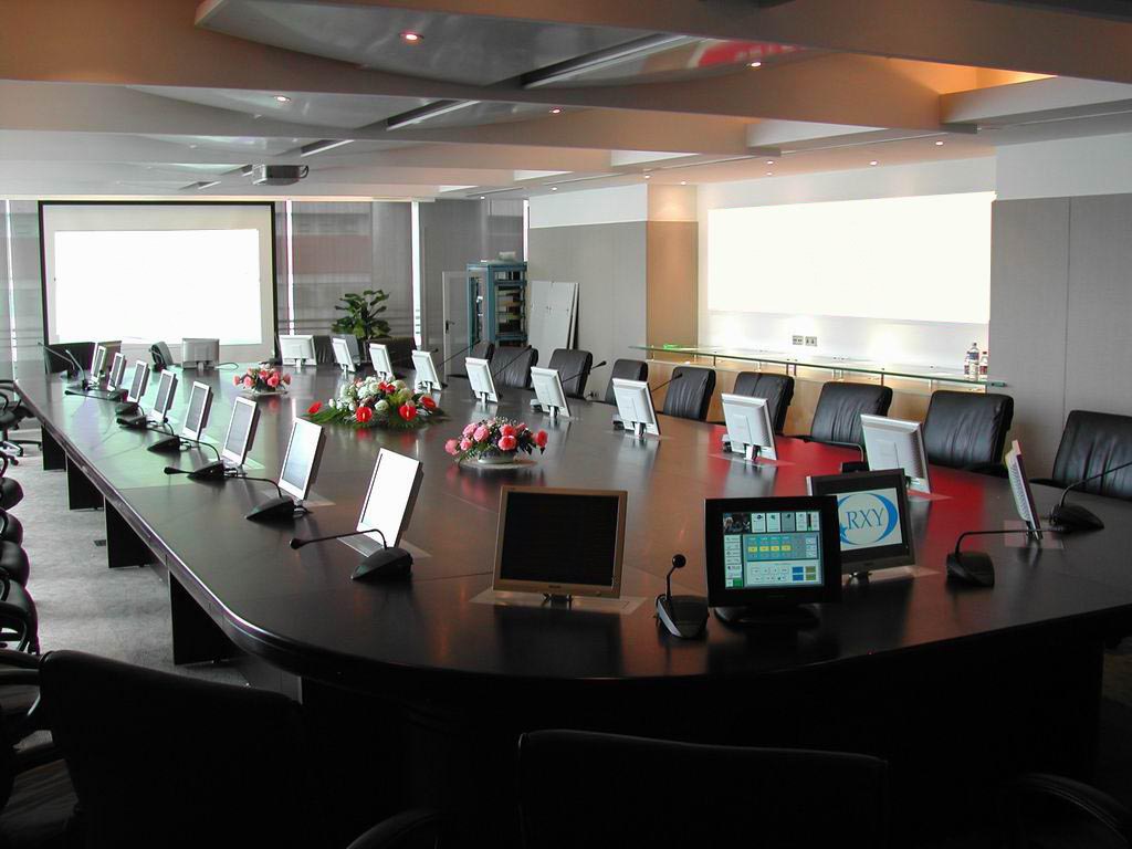 面、当不使用显示器时,升降机自动下降,显示器隐藏在会议桌内,起到